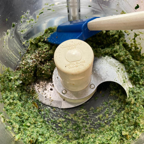 Start by sautéing the shallots low and slow in 2 TB olive oil until they are soft and golden brown - about 15 minutes. Add the whole garlic clove for the last 4-5 minutes. Scrape them into a Cuisinart to cool. In the same pan, add another 2 TB olive oil and sauté the spinach on medium low heat until wilted. Spinach gives off a lot of liquid - the mortal enemy of crisp pastry - so you’ll need to squeeze it in paper towels (or with your bare hands if you’ve cooled it). Once it’s as dry as you can get it, throw it in the Cuisinart along with the Boursin cheese. Blitz until smooth and add salt and pepper to taste.