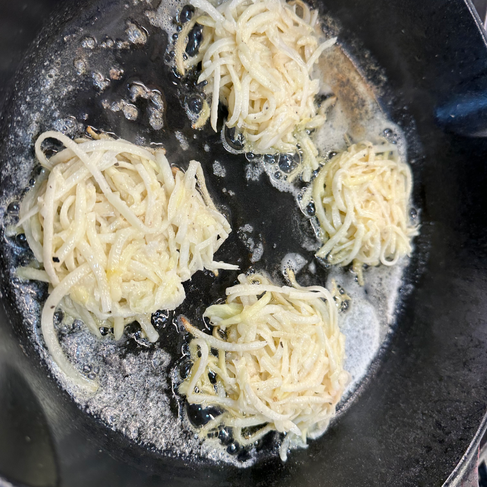 Heat a large (12 in.) skillet over medium-high heat. Add 2 tablespoons of butter and 1 tablespoon of oil and heat until sizzling. Drop ⅓ cup measures of the potato mixture into the pan, leaving a little space between. Using a spatula, lightly flatten the latke. Cook over medium-high heat for 3-4 minutes, until golden brown. Flip and cook on the other side for 2-3 minutes, until nicely browned. Transfer to a plate lined with paper towels or a rack on a baking sheet in a 350F oven. Repeat with the remaining mixture.