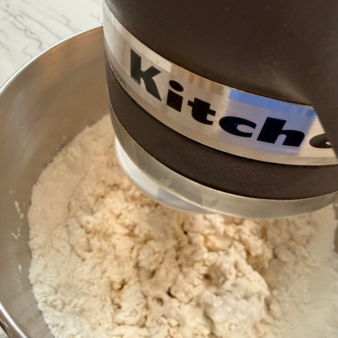 Mix dough. Mix ingredients on low for 1 minute, then increase speed and continue mixing for another 2 minutes until a sticky but smooth dough forms.