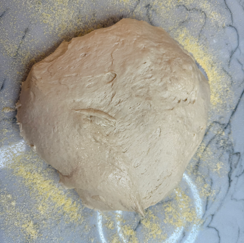 Prepare baking sheets and work surfaces. Line two sheet pans with parchment paper, sprinkle 1/4 cup of the cornmeal, and set aside. Sprinkle half of the remaining cornmeal (~⅓ cup..ish) on a sanitized work surface.