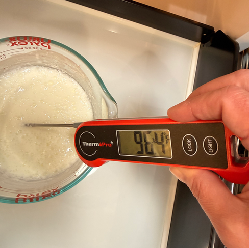 Prepare the buttermilk. On the stovetop, watching like a hawk, heat 1 1/2 cups of buttermilk to 105 degrees (don’t be like me - I scalded the buttermilk in the microwave and it separated, so I had to start over). In a standing mixer fitted with the dough hook, add the remaining cold buttermilk. In the standing mixer with the cold buttermilk, pour in the warm buttermilk followed by the yeast, butter, honey, bread flour, sugar, and salt.