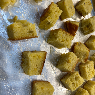 You can either make the croutons from store bought cornbread, or, be extra like me and make your own using Houston’s recipe (using child labor, of course). Once cooked and cooled, you can cube and spray with cooking spray. Broil until lightly browned and crisp.